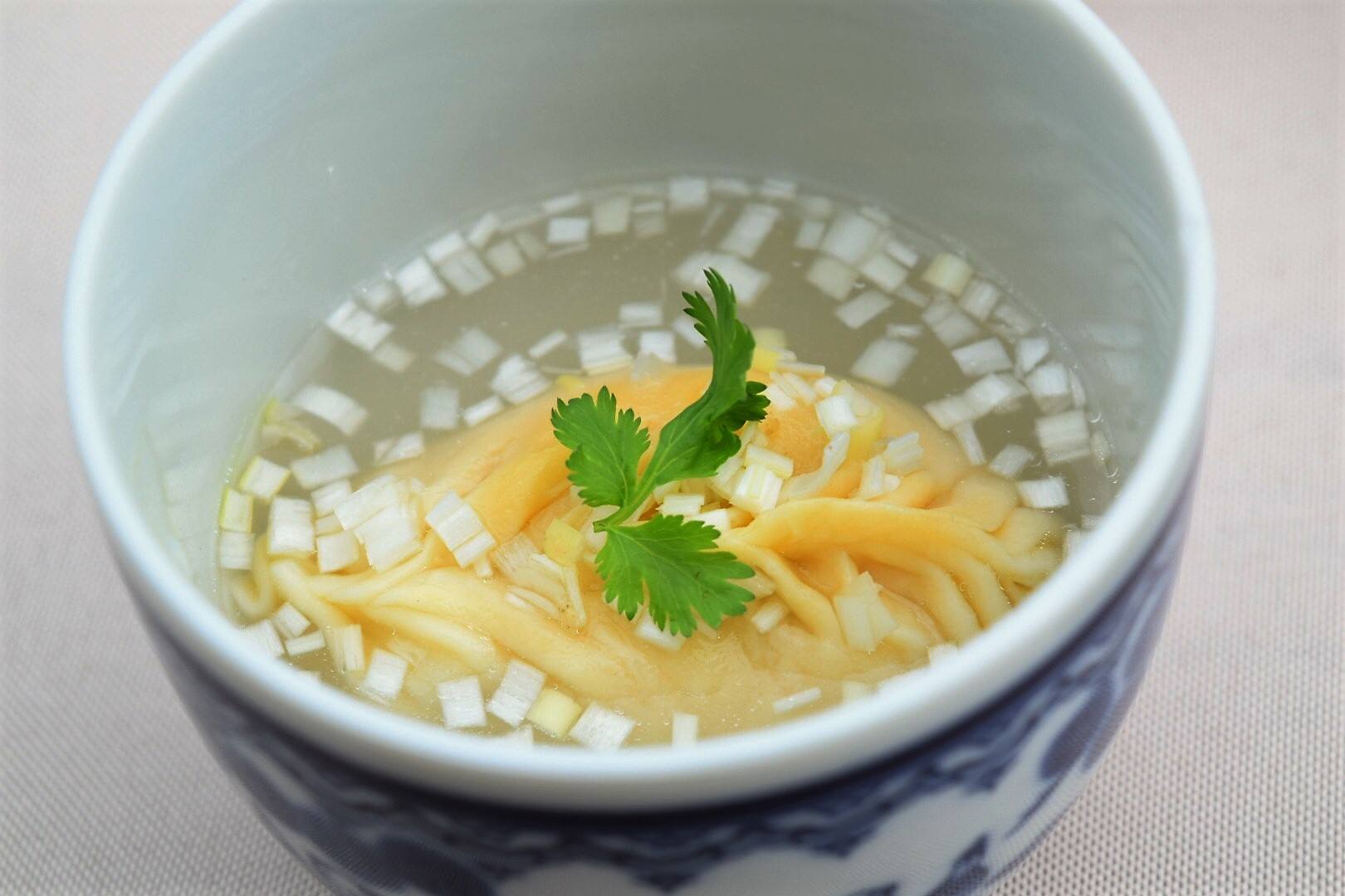 豚肩ロース、蝦、人参、筍、椎茸、スープの煮凝りを合わせたミンチを卵と小麦粉だけで作った生地で包みスープに入れて器ごと蒸して食べる点心。